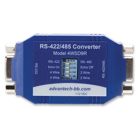Model 4WSD9R, a universal serial converter, provides RS-232 to RS-422/RS-485 conversion using either port-power or an external power supply. Data is converted in both directions. RS-232 Transmit Data is converted to balanced RS-422 or RS-485 Transmit Data. Received RS-422/485 signals are converted to RS-232. The RS-232 port is a DB9 female connector (DCE) with pins 2(RD), 3(TD), and 5(Signal Ground) supported. Pins 7(RTS) and 8(CTS) are tied together. Pins 6(DSR), 1(DCD), and 4(DTR) are also tied together. Model 4WSD9R has a DB9 female RS-485 connector. Automatic Send Data Control - Unlike converters that require programming hardware handshaking signals to control RS-422 or RS-485 operation, Model 4WSD9R provides automatic Send Data Control. No handshaking is required to control the RS-422/485 driver. Operating mode is set via a dipswitch. In RS-485 mode, the RS-485 driver is enabled by special circuitry which senses the RS-232 TD input. In half-duplex RS-485 mode, the receiver is enabled when not transmitting. For full-duplex operation, the receiver is set as always enabled. In RS-422 mode, the transmitter and receiver are always enabled. Port Power via RS-232 - Incoming RS-232 data lines in either the high or low state are used to port power the converter. If two RS-232 output handshake lines are available and the cable run is short, no external power is needed. The more handshake lines available, the more likely the unit can be port powered. If the handshake lines are raised and no termination is used, power efficiency is greatly increased. External Power Supply - Less than 3 mA is required to operate the converter - plus the load current. If not enough power is available from the RS-232 port, or not enough handshake lines are available, or a larger load current is required, the converter may be powered by an external 12 VDC power supply with a 2.5mm plug (tip positive). A DC jack on the converter supports external power. (Power supply not included, sold separately.)